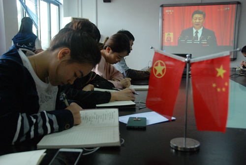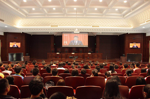 同学们认真聆听习近平总书记在开幕式上所作的工作报告。总书记强调,全党要坚定不移沿着中国特色社会主义道路前进,要不忘初心、牢记使命,高举中国特色社会主义伟大旗帜,决胜全面建成小康社会,夺取新时代中国特色社会主义伟大胜利,为实现中华民族伟大复兴的中国梦不懈奋斗。