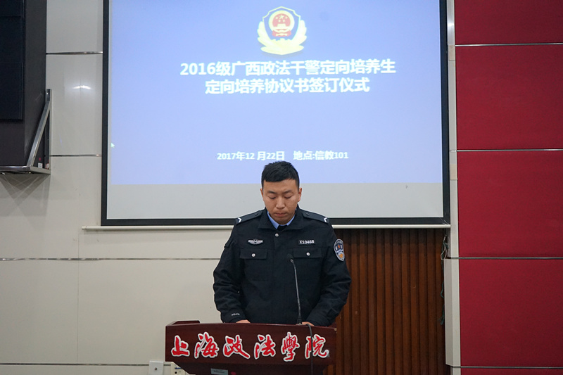 签约仪式之前,各位领导与学员们共同观看了新利18官方客服政法干警学员风采视频,该视频充分展现了我校政法干警学员良好的精神风貌和严肃的纪律作风。徐海琨对远道而来的广西司法行政系统领导们表示了感谢,向他们汇报了2016级广西政法干警学员在校的表现情况,介绍了学校的培养计划和教学模式,就改进培养教学方法进行了探讨。2016级广西政法干警学员在校表现十分优异,在多次代表学校参加的市级、国家级比赛中担当主力并取得了出色的成绩,对广西学员们的辛苦付出表示了感谢。干警学员代表胡孝文发言,谈到入校以来在政法干警试点班学习的感受和收获,号召学员们继续努力学习,为明年步入工作岗位打下扎实的基础。