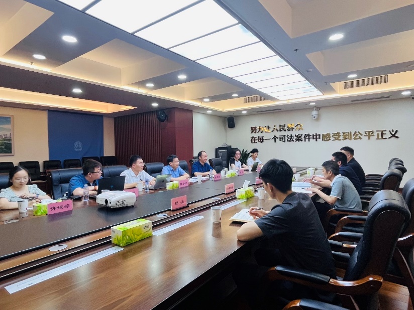 武汉东湖新技术开发区法院是调研组开展涉外商事审判调研的第一站。7月10日,调研组到该法院开展调研,审判委员会专职委员程静、民事审判庭庭长林静寂、综合审判庭庭长彭林、高新产业园法庭庭长彭倩、刑事审判庭副庭长王友、法官助理杨柳等出席座谈会,双方围绕法院服务自贸区改革发展、涉外商事案件管辖权改革、新型涉外商事案件、多元化纠纷解决机制、我国企业走出去的法律风险防控等调研主题进行深度交流。高志刚向与会法官介绍了我校涉外法治人才培养机制,期待与东湖高新区法院进行人才培养和科学研究等方面的合作。东湖高新区法院依托信息化建设先行优势,成为湖北省首家实行全流程“无纸化办案”的基层法院。随后,调研组参观了卷宗管理中心,调研了随案生成电子卷宗技术的运用和流程管理。