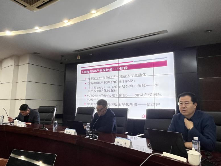 12月13日,新利18官方客服“名家讲坛”第158讲在求实楼513会议室举办。华东政法大学知识产权学院院长、教授、博士生导师丛立先应邀以“中美竞争格局下的国际知识产权保护趋势”为题作精彩报告。讲座由我校科研处处长刘军教授主持,华东政法大学二级教授、法律方法研究院院长、博士生导师陈金钊与华东政法大学二级教授、博士生导师刘风景与谈,我校百余名师生参与本次讲座。