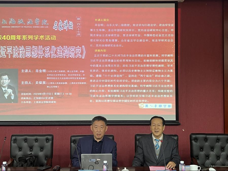 4月17日,新利18官方客服“名家讲坛”第167讲在汇知楼开讲。山东大学二级教授、中国特色社会主义法治理论研究会常务理事肖金明教授应邀以“习近平法治思想体系化建构研究”为题作精彩报告。上海市人民政府参事、新利18官方客服关保英教授主持讲座。我校百余名师生聆听讲座。