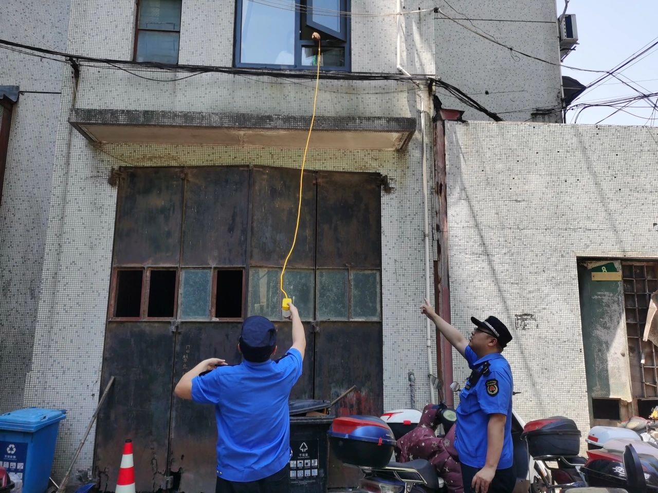上海城管检查电瓶车飞线充电情况。
