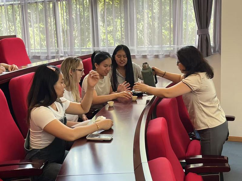 互动环节中,留学生分享了各自国家饮茶习惯与中国茶俗的异同,张老师指出:“全球80余个产茶国的文化基因中,都能找到中国茶文化的密码。”她为学生们讲解梳理了茶文化从“丝绸之路”到“万里茶道”的传播脉络,并特别解析了国际茶日的设立历程,“2019年联合国确立5月21日为国际茶日,这既是对中国茶文化历史贡献的认可,更是构建‘茶香命运共同体’的全球实践。”