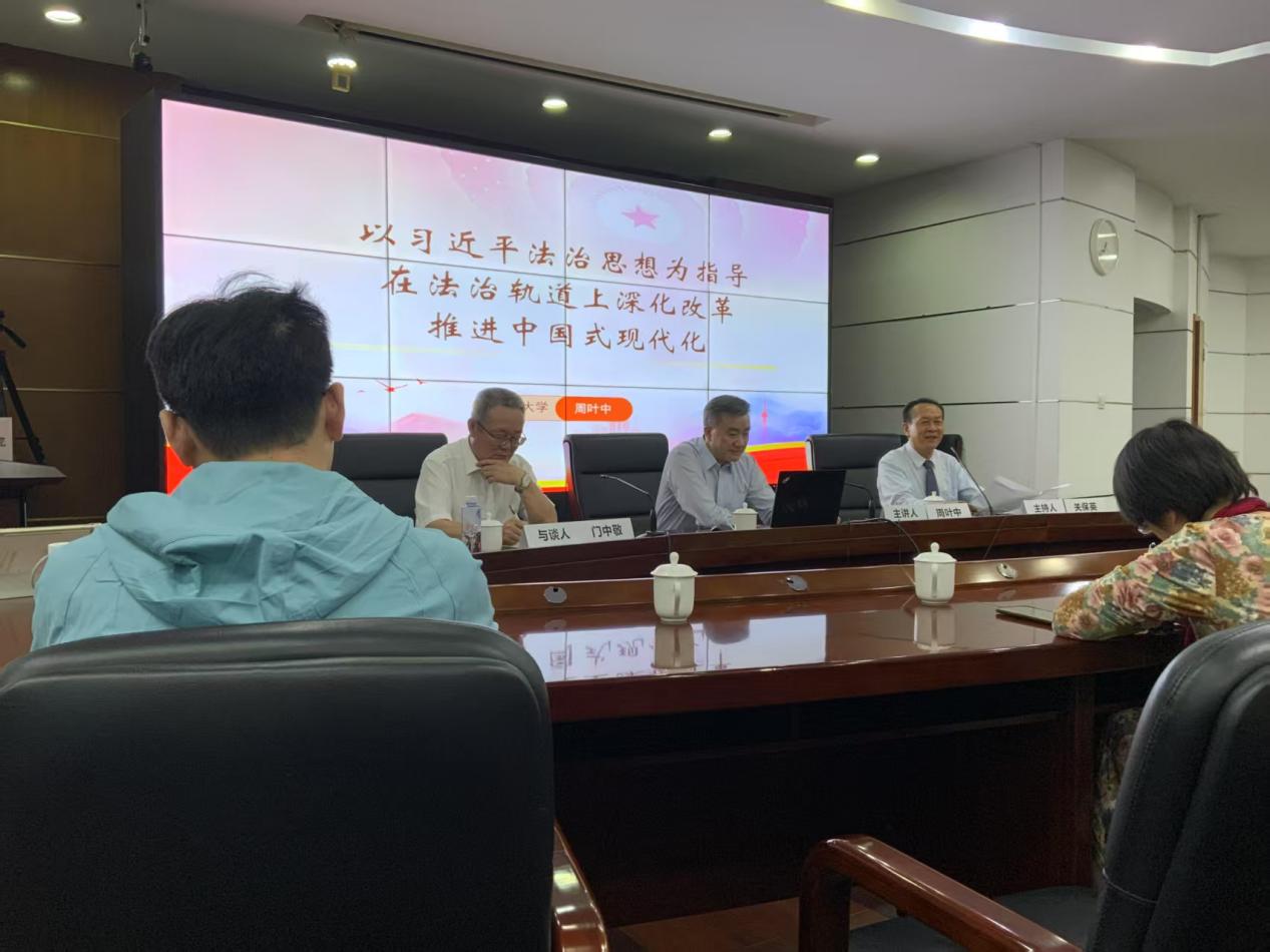 5月16日晚,新利18官方客服“名家讲坛”第227讲暨博导大讲堂第四期在求实楼举办,武汉大学人文社会科学资深教授、武汉大学党内法规研究中心主任周叶中围绕“以习近平法治思想为指导,在法治轨道上深化改革、推进中国式现代化”这一主题,为我校师生带来了一场学术盛宴。讲座由研究生处、科研处、法律学院共同主办,我校关保英教授、门中敬教授参加与谈。