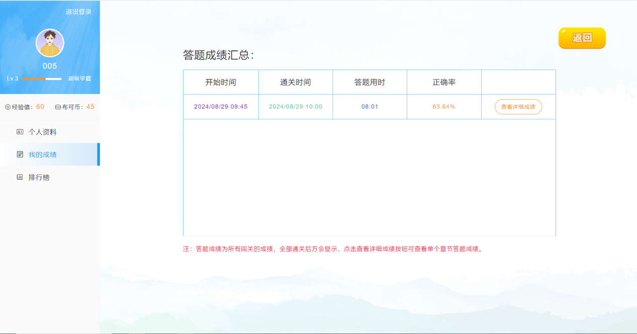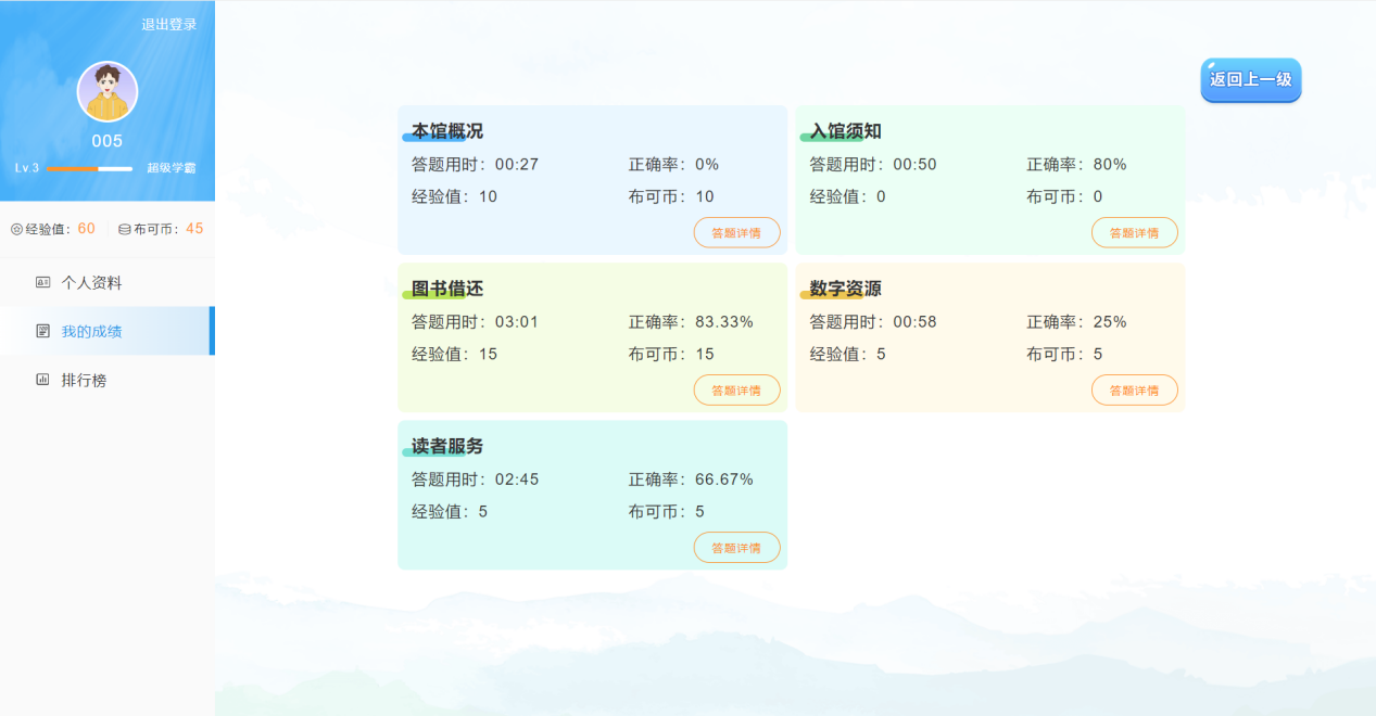 5.所有的学习和闯关都完成后,可以在个人中心查看个人成绩和排名,查看经验值和布可币的获取情况,答题详情也会在这里展示哦~
