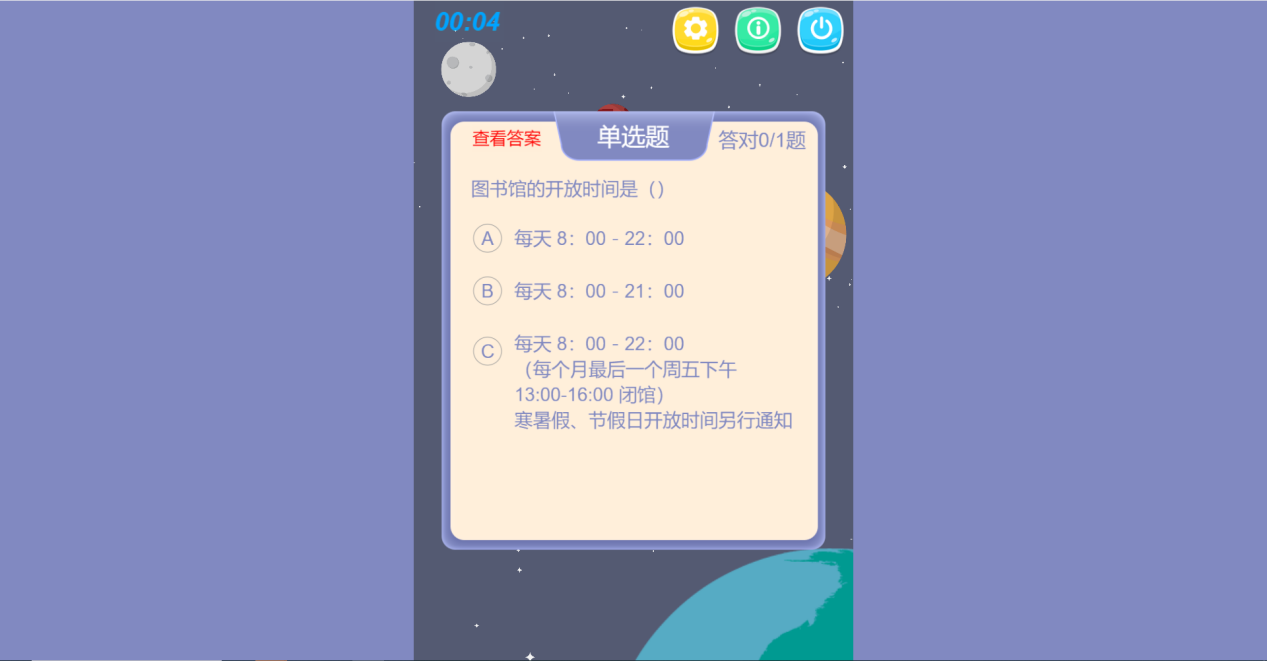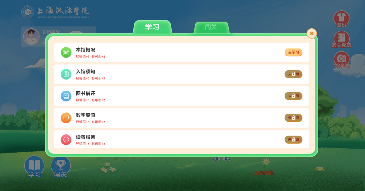 3.点击学习按钮开始图书馆的学习啦,每学习完一个章节会解锁一个游戏关卡,学习和闯关都会获得相应的布可币和经验值。闯关游戏中会有试题的出现,请同学们认真作答,答对的题目越多获得的布可币就会越多哦~
