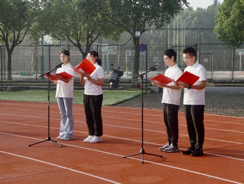 上午7点,升旗仪式准时开始,全体师生整齐列队、庄严肃立,向国旗行注目礼,齐唱国歌。鲜艳的五星红旗在庄严的国歌声中冉冉升起、迎风飘扬,师生们怀着崇高敬意向国旗行注目礼,表达对祖国的无限热爱和深情祝福。