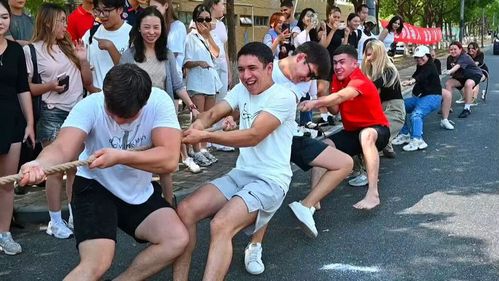 随着裁判哨声响起,不同肤色的手紧紧攥住粗绳,中国学生队员整齐喊出节奏铿锵的号子,留学生队员迅速跟上节拍,以洪亮的嘶吼传递力量,绳索中央的红布在两队间来回拉锯,胜负难分。