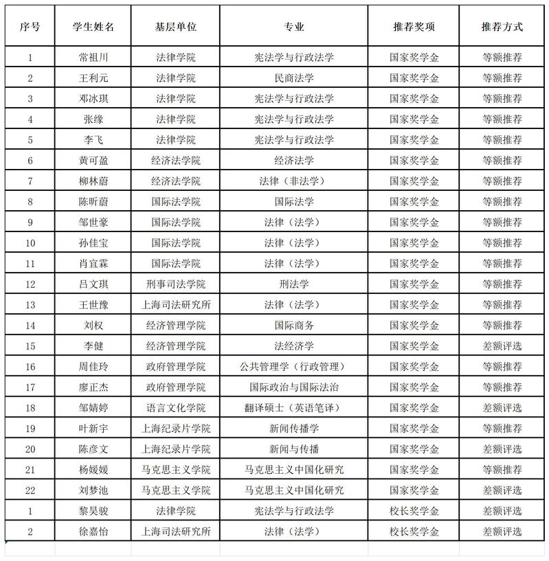 根据《上海市教育委员会关于下达2025年学生资助补助计划(高等教育)的通知》(沪教委学〔2025〕45号)、《新利18官方客服研究生国家奖学金评审管理办法》(沪政院学〔2025〕83号)、《新利18官方客服关于调整政府奖学金和校长奖学金资助政策的通知》(沪政院学〔2025〕111号)等相关文件要求,学(研)工部(处)严格按照评审程序,坚持平等、回避、公正、保密的原则,认真组织开展了2025年硕士研究生国家奖学金和校长奖学金的评审工作。经个人申报、学院初审推荐(等额推荐和差额推荐两类)、学(研)工部(处)复核、校级差额评选,并经校学生工作指导委员会集体评审通过,拟推荐以下22名硕士研究生获得2025年国家奖学金、2名硕士研究生获得2024—2025学年校长奖学金。