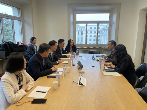 在联合国和平大学,代表团与校方代表联合国和平大学常驻联合国日内瓦办事处及其他国际组织观察员大卫·费尔南德斯·普亚纳教授举行工作会议。双方回顾了已有合作成果,并就学生交流、国际组织工作坊、海外专家讲座及聘任等具体事项进行了详细讨论,为双方进一步合作打下扎实基础。