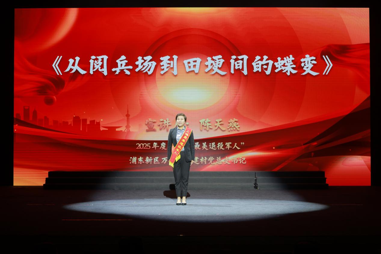 2025年度上海“最美退役军人”、上海市浦东新区万祥镇新建村党总支书记陈天燕带来主题宣讲《从阅兵场到田埂间的蝶变》。陈天燕在宣讲中讲述了她从阅兵场的铿锵正步到田埂间的乡村振兴之路,正是无数个陈天燕“退役不褪色”的坚守,让我们看到退役军人在基层一线的责任与担当。