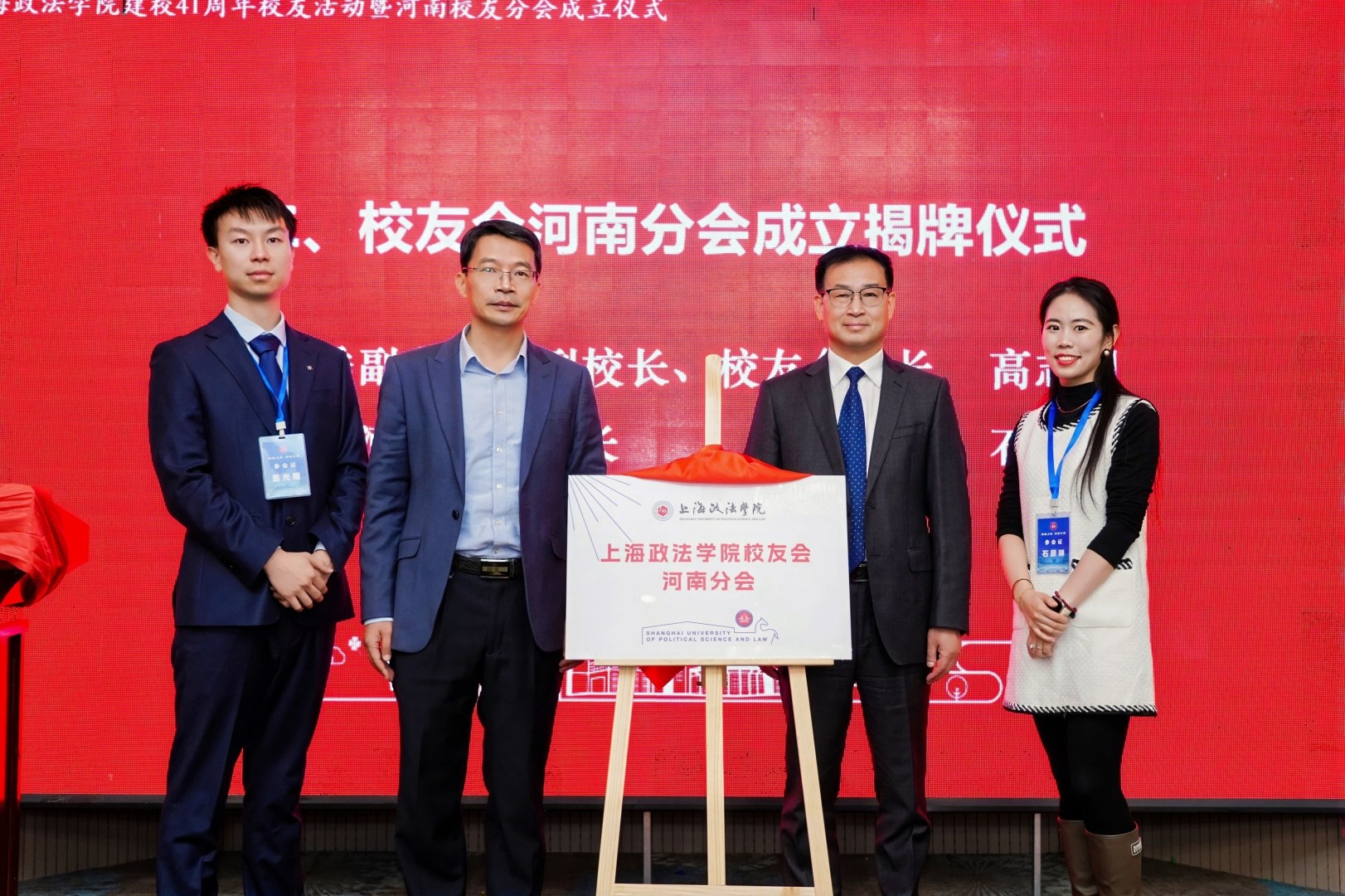成立仪式上,大会选举产生了河南分会第一届理事会成员,高志刚为河南分会会长石愿琳、执行会长盖光耀颁发聘书。随后,高志刚、罗松远与河南分会代表共同为“新利18官方客服校友会河南分会”揭牌,标志着河南分会正式成立。