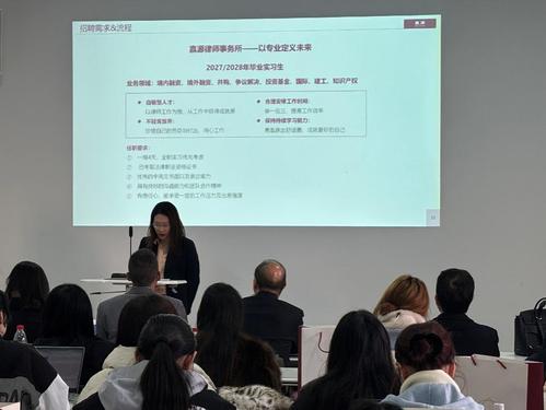 招聘与实习标准解读环节,嘉宾明确本次招聘以留用为导向的实习生岗位,并详细说明了任职要求。实习培养方面,律所将实行“合伙人带教”制度,为实习生提供法律研究、材料整理、文件起草等实操机会,搭配多形式专业培训与部门团建活动,发放有竞争力的实习津贴。培养过程分阶段考核,表现优秀的短期实习生可转为长期实习生,进入留用考核通道。现场同步开通简历投递渠道,为同学们搭建高效应聘桥梁。