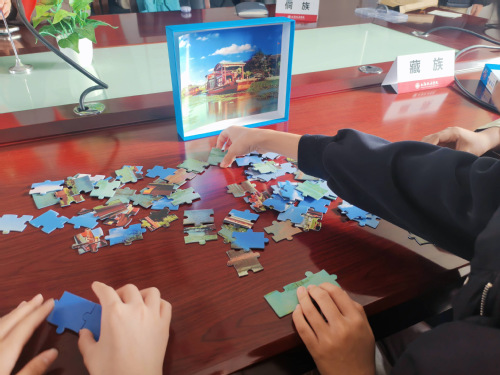 知识竞答环节气氛热烈,题目涵盖各民族历史渊源、传统节日、文化遗产等内容,大家踊跃抢答、相互补充,在轻松氛围中深化了对民族知识的认知。趣味实践区更是人头攒动,串串珠活动中,大家巧手穿引,将对民族团结的期盼融入晶莹饰品;画小油纸伞环节,各族学子共同勾勒民族元素与吉祥图案,让非遗技艺在创意中传承;红色党性地址拼图则将井天安门、中共一大、红船等革命圣地融入游戏,在协作解谜中厚植红色基因,强化党性修养。