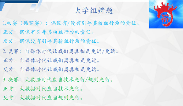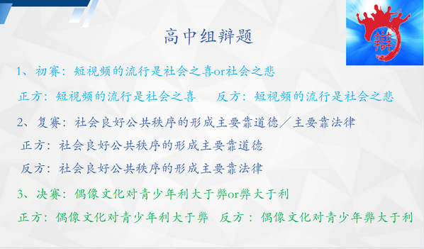 “真理越辩越明,道理越讲越清”,青少年法治教育是提升全体公民法治意识和法治素养的重要抓手。在建党百年之际,在全面推进依法治国、加快建设社会主义法治国家的背景下,上海市高校大学生、高中生法治辩论赛将以弘扬法治精神,推动大中小学法治宣传教育和德育一体化为目标,加强组织力度、提升活动质量、扩大品牌影响力,为提升新时代青少年的法治意识和思辨能力搭建平台、为营造青少年学法用法遵法守法的浓烈氛围铺设载体、为展现学生青春风采和责任担当提供舞台。