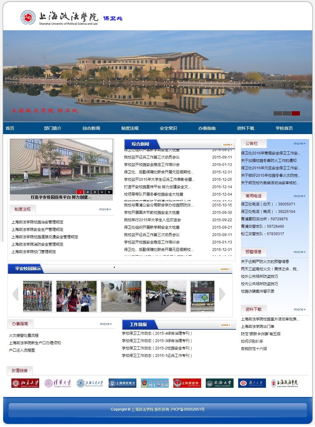 新网站专设“预警信息”、“综合信息”、“资料下载”、“办事指南”、“工作简报”等板块,以期进一步增强师生员工安全防范意识,提升安全防范能力。其中预警信息包括:防诈骗、安全生产、治安管理、消防安全、交通安全、网络安全等内容,并结合“平安校园宣传栏”的建设。保卫处将定期发布预警信息,进一步丰富专题内容,增强吸引力,打造校园安全教育与宣传新平台。