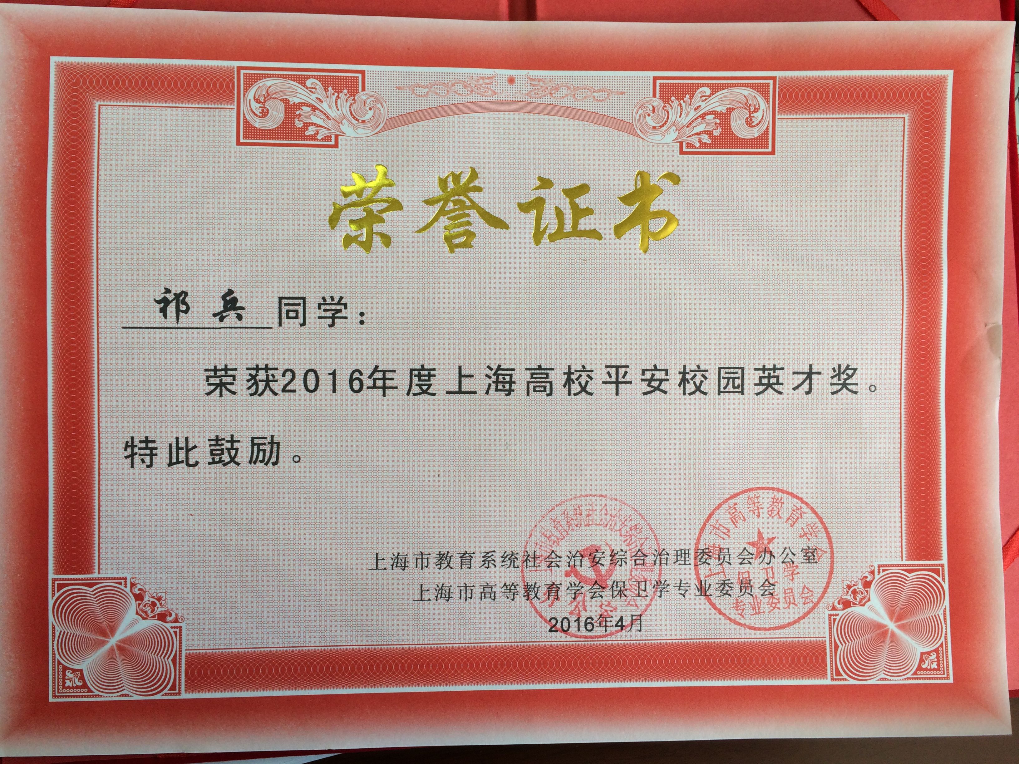 近日,根据上海高等教育学会保卫学专业委员会关于表彰“上海高校平安校园英才奖”的决定,我校祁兵同学获此殊荣。