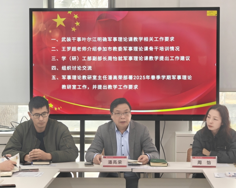 为认真做好2024级学生的军事理论教学,提升教学的质量和效果,2月24日下午,武装保卫部(处)在求实楼117召开2025学年春季学期军事理论教学工作会议,军事理论课教研室全体授课老师参加会议,会议由军事理论课教研室主任潘高荣主持。