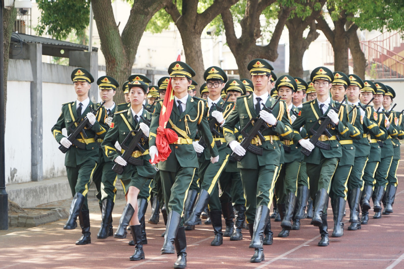 上午9时整,36名国旗护卫队队员身着礼服,肩披金色绶带,以铿锵有力的正步入场,护卫国旗。军靴踏地,轰鸣声如战鼓催征,整齐的步伐在肃穆的操场上回响,激荡起每一个人的心弦。雄壮的《义勇军进行曲》划破天际,五星红旗在全体师生注目礼中冉冉升起,迎风舒展。