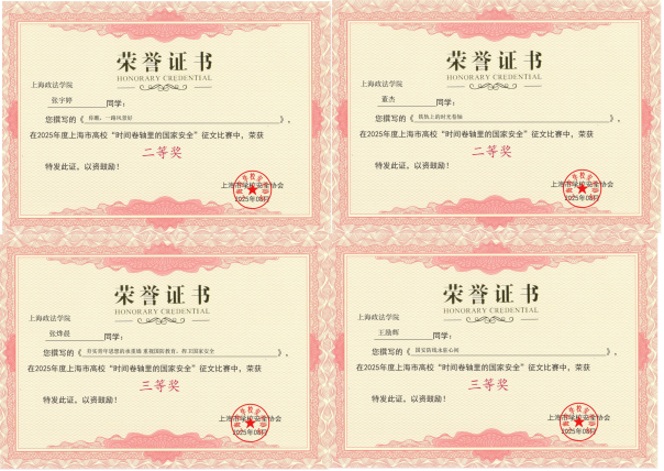经市教委安全协会聘请相关专家严格评审,我校多位同学在众多参赛选手中脱颖而出。其中,法律学院的张宇婷同学、经济法学院的董杰同学凭借出色的文笔和深刻的见解,分别荣获二等奖;经济法学院的张烨晨同学、国际法学院的王励辉同学表现优异,分别荣获三等奖。这些获奖作品不仅彰显了作者深厚的文字功底,更凸显了他们对国家安全的高度关注与责任感,为全校师生树立了良好的榜样。