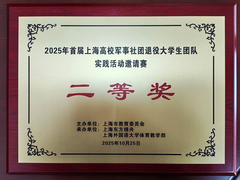 2025年10月25日,由上海市教育委员会主办,上海东方绿舟、上海外国语大学体育教学部联合承办的“2025年首届上海高校军事社团退役大学生团队实践活动邀请赛”在上海外国语大学成功举办。我校武装保卫部(处)组织六名退役优秀学生代表参赛,凭借过硬的军事素养和出色的团队协作,在激烈的角逐中脱颖而出,最终荣获大赛二等奖。