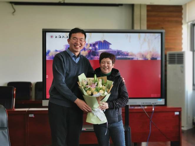 仪式伊始,高志刚代表党办校办向陆满娟老师赠送荣休纪念品,郭小杰作为最年轻教师代表向陆满娟老师献花。