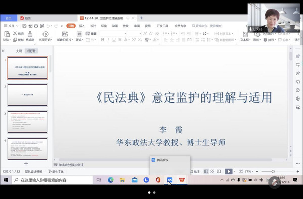 12月14日下午,法律学院卓越法律论坛第92期暨民法方法与案例研究讲坛第8期以线上方式举行,邀请华东政法大学教授李霞以“民法典时代意定监护新阐释及适用”为题发表演讲。本次论坛由法律学院、民法方法与案例研究中心、知联会共同主办,法律学院王康教授主持,中国政法大学夏江皓博士、我校法律学院季平平博士与谈。
