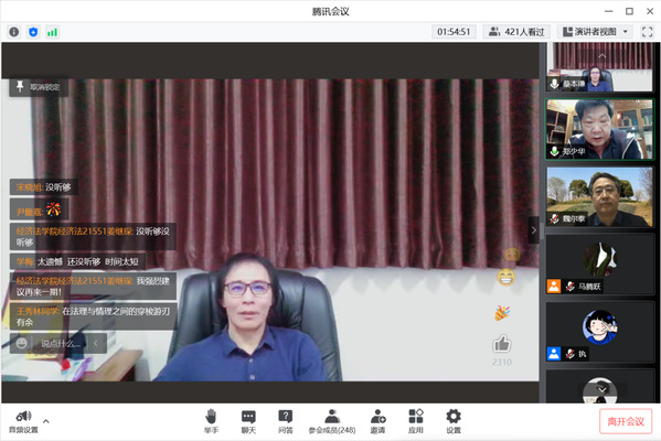 参会学生在腾讯会议聊天中与主讲人、与谈人积极互动、收获颇丰,纷纷表示通过此次讲座的学习,对法律联结问题有了更加清晰的理解,同时也对法经济学研究方法的应用有了更加深刻的认识。(刘欣鑫、储沁 撰稿、摄影)