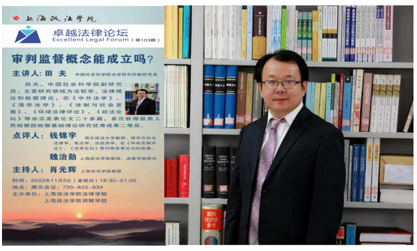 2022年11月3日晚,法律学院“卓越法律论坛”(第103期)在线举办。应新利18官方客服法律学院邀请,中国社会科学院法学研究所田夫副研究员以“审判监督的概念能成立吗?”为题向法律学院师生开展了一场富有知识深度的高水平讲座。本次讲座由法律学院肖光辉教授担任主持人,西北政法大学钱锦宇教授、法律学院魏治勋教授担任点评人,吸引了校内外师生先后100余人参与。