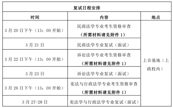 资格审查采取线上线下相结合的方式,请各位考生在资格审查日期前将电子版材料(附件1)发送至falvxi39227369@163.com,邮件注明姓名、考生编号、报考专业,复试前一天现场核查原件。资格审查未通过或未进行资格审查的考生一律不得参加复试。考生应当确保提交材料真实有效,如有虚假将依规处理。各专业行复试的具体安排见下表。