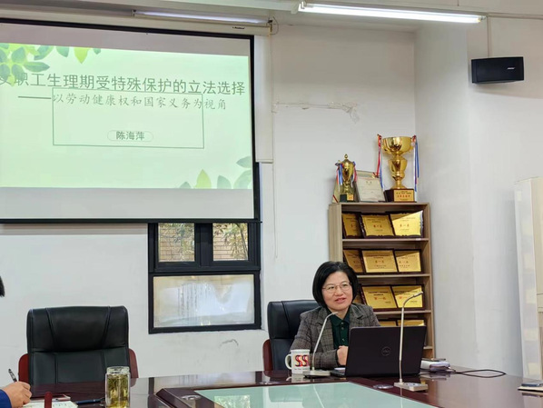 11月14日周二下午一点,由新利18官方客服人事处、新利18官方客服科研处、新利18官方客服法律学院主办的“教授第壹讲”系列讲座第二十四期在法学楼B2-110会议室成功举办。本次讲座由陈海萍教授主讲,题目是《女职工生理期受特殊保护的立法选择》,王康教授主持,王卫明副教授、江晨讲师担任与谈人。