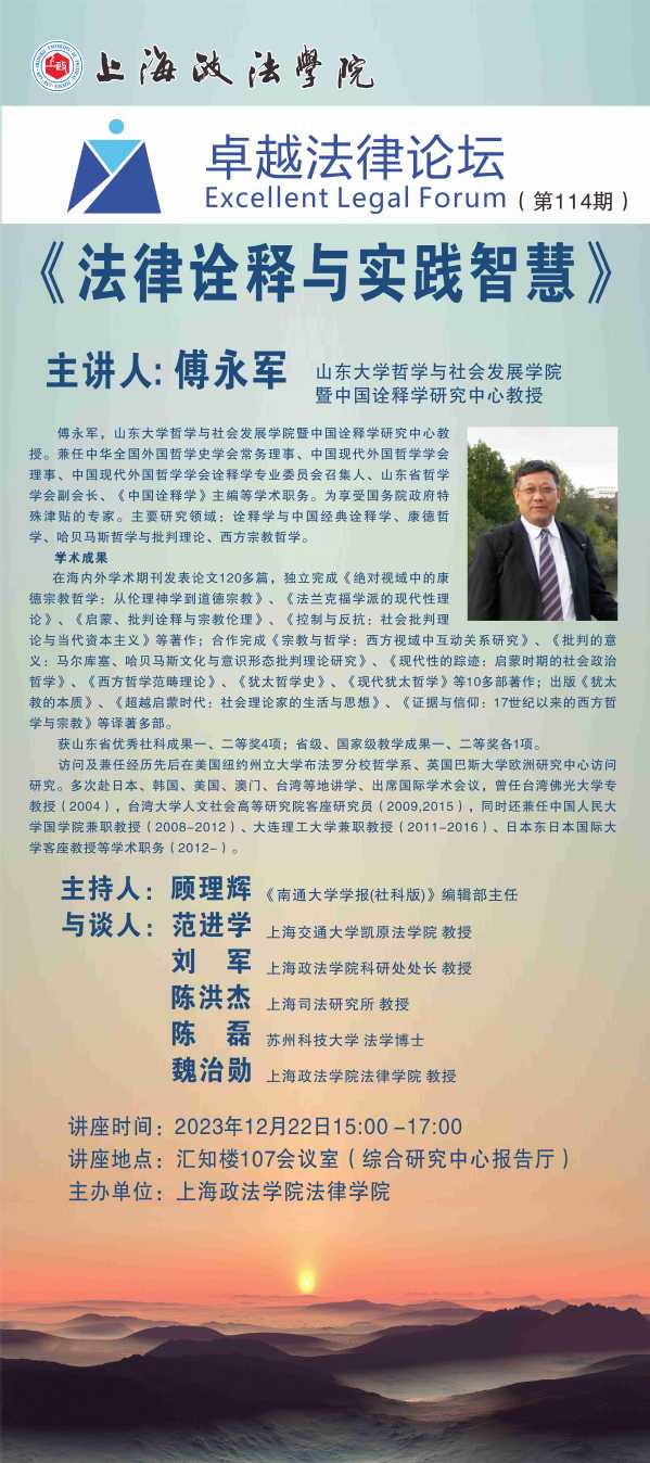 2023年12月22日下午15:00——17:00,新利18官方客服法律学院第114期“卓越法律论坛”在汇知楼107会议室举办,本期论坛以“法律诠释与实践智慧”为主题,邀请了山东大学哲学与社会发展学院暨中国诠释学研究中心傅永军教授作学术讲座。本次讲座由《南通大学学报(社科版)》编辑部主任顾理辉主持,上海交通大学凯原法学院范进学教授、新利18官方客服科研处处长刘军教授、上海司法研究所陈洪杰教授、新利18官方客服法律学院魏治勋教授、苏州科技大学陈磊博士担任与谈人。