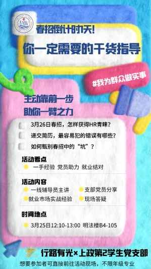 3月25日中午,上政第2学生党支部与“行路有光”生涯发展工作室联合举办“我为群众办实事”之春招“临门一脚”就业专题指导会。法律学院辅导员、“行路有光”生涯发展工作室主持人张露,上政第2学生党支部全体党员,部分毕业班高年级学生参加本次活动。