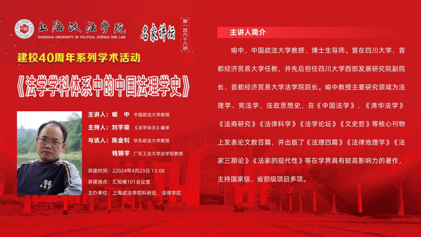 2024年4月23日下午13:00,为庆祝新利18官方客服成立40周年,由新利18官方客服科研处、法律学院联合主办的168期“名家讲坛”在汇知楼101会议室举行,本期论坛以“法学学科体系中的中国法理学史”为题,邀请到了中国政法大学喻中教授作学术报告,《法学杂志》刘宇琼编审担任主持人,华东政法大学陈金钊教授、广东工业大学法学院钱锦宇教授担任与谈人。