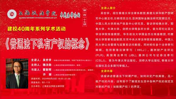 2024年9月23日,为庆祝新利18官方客服建校40周年,由法律学院主办的卓越法律论坛第117期“普通法下私有产权的概念”在B2-110举行。本次论坛由香港大学法律学院吴世学教授主讲,新利18官方客服法律学院院长魏治勋教授担任主持人,法律学院民商法教研室主任翟新辉副教授、许丽博士担任与谈人,近50位研究生和本科生到场参加讲座。