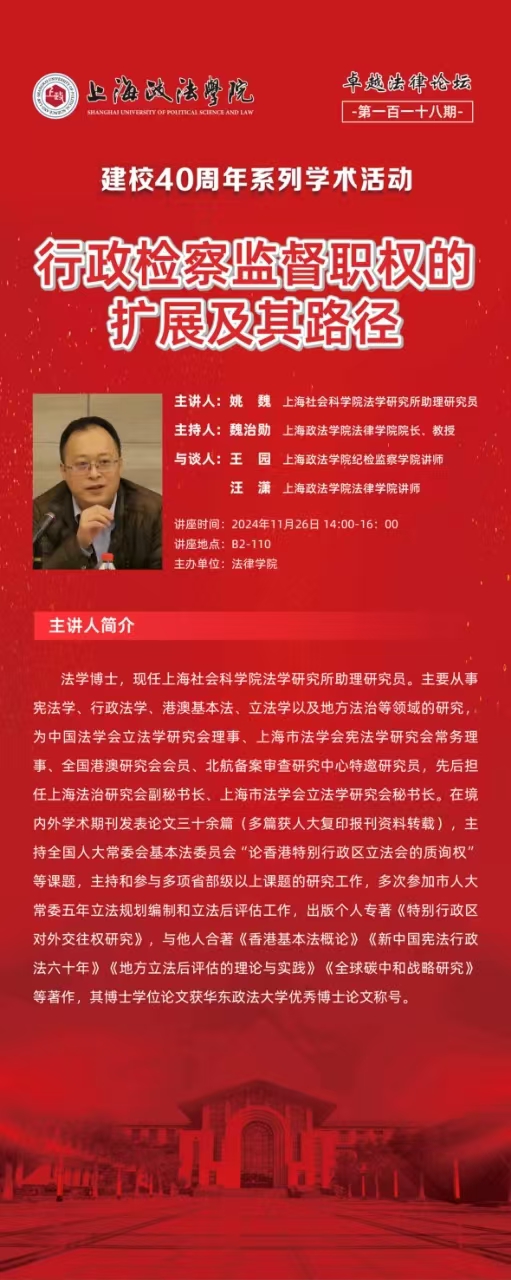 2024年11月26日,为庆祝新利18官方客服建校40周年,由法律学院主办的卓越法律论坛第118期“行政检察监督职权的扩展及其路径”在B2-110举行。本次论坛由上海社会科学院法学研究所助理研究员姚魏博士主讲,新利18官方客服法律学院院长魏治勋教授担任主持人,纪检监察学院王园博士、法律学院陈海萍教授、汪潇博士担任与谈人,50余位研究生和本科生到场参加讲座。