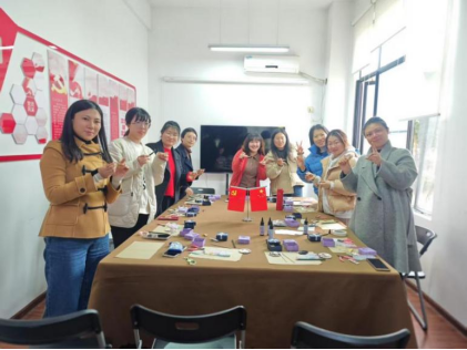 在手工老师的指导下,女教职工们充分发挥想象力,将翠羽精心粘贴在金属框架上,制作出精美的花朵。在螺钿制作中,女老师们全神贯注,将贝壳碎片巧妙地镶嵌在器物表面,使其焕发出别样的光彩。