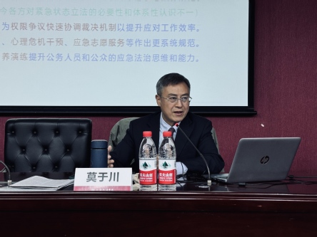 与谈环节,吴明熠老师对莫于川教授的讲座内容进行了系统总结,认为莫教授的讲座为今后开展应急法治相关课题研究提供了新思路、新视角、新方法。并立足现代风险所具有的广泛的不确定性,剖析了现代风险社会的特质,认为应急法治的目的追求的是一种应急管理中的利益平衡,强调的是重大公共利益、公民利益、秩序稳定的协调发展。提出为了更好回应现代风险社会的特质、也为大修后的《中华人民共和国突发事件应对法》能真正发挥效用,应在实践中关注“在风险预防中科学识别‘风险阈值’”“ 法律解释、逻辑思辨等法学方法的运用”“ 突发状态下行政法治的强调”等问题。