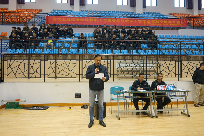 为营造拼搏向上的体育文化氛围,丰富教职工和干警学员的业余生活,增进教职工和干警学员之间的沟通交流。11月21日下午,首届新利18官方客服教职工篮球社团与警务学院政法干警学员篮球交流赛在比赛馆开赛。此次篮球交流赛由校工会主办,校工会教职工篮球社团、警务学院承办。校工会常务副主席周毅、体育部主任谭小勇、警务学院党总支副书记储德峰、刑事司法学院党总支副书记徐海琨以及政法干警辅导员谢晨杰、浦文玮到场助威,政法干警全体学员与刑事司法学院2017级学生到场观赛。