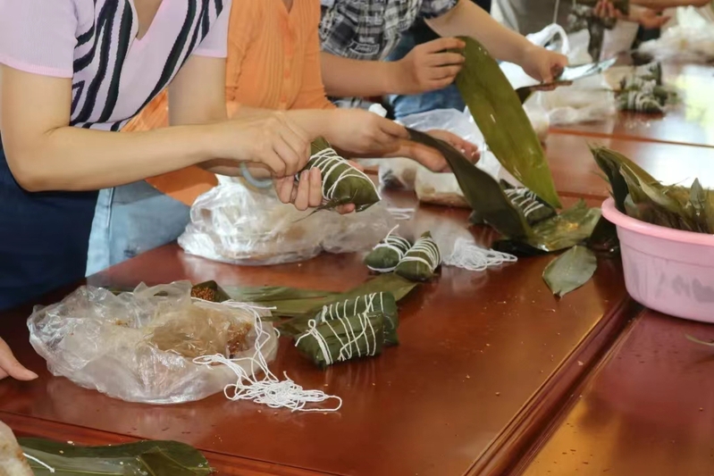 活动伊始,经验丰富的教职工们纷纷展示了自己的包粽子技巧。他们熟练地将粽叶卷成漏斗状,填入糯米和馅料,然后用细绳紧紧扎住,一个个形状饱满、寓意吉祥的粽子便诞生了。年轻的教职工们也不甘示弱,认真学习包粽子的方法,很快便掌握了要领。大家手中动作不停,欢声笑语不断。
