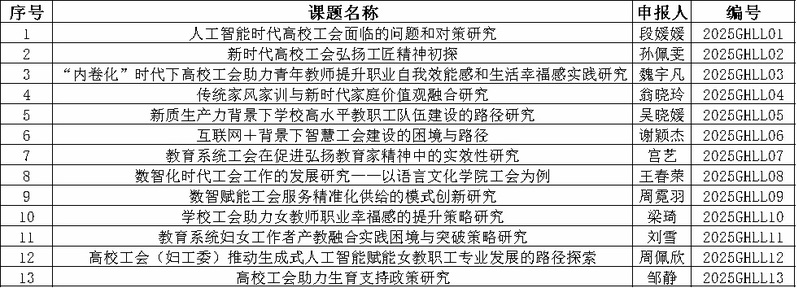 为全面贯彻落实党的二十大和二十届二中、三中全会精神,不断加强工会理论研究和妇女理论研究工作。根据上海市教育工会的工作安排,我校工会连续多年坚持开门研究,吸收工会内外理论研究骨干、基层工作者开展工会理论和妇女理论研究工作,深入推进工会理论研究和妇女理论研究工作,聚焦教职工急难愁盼问题。经专家组评审,申报课题中13项作为校级2025—2026年度工会理论研究与调查研究(妇女理论研究)工作立项课题予以支持、培育。现将立项课题公布如下: