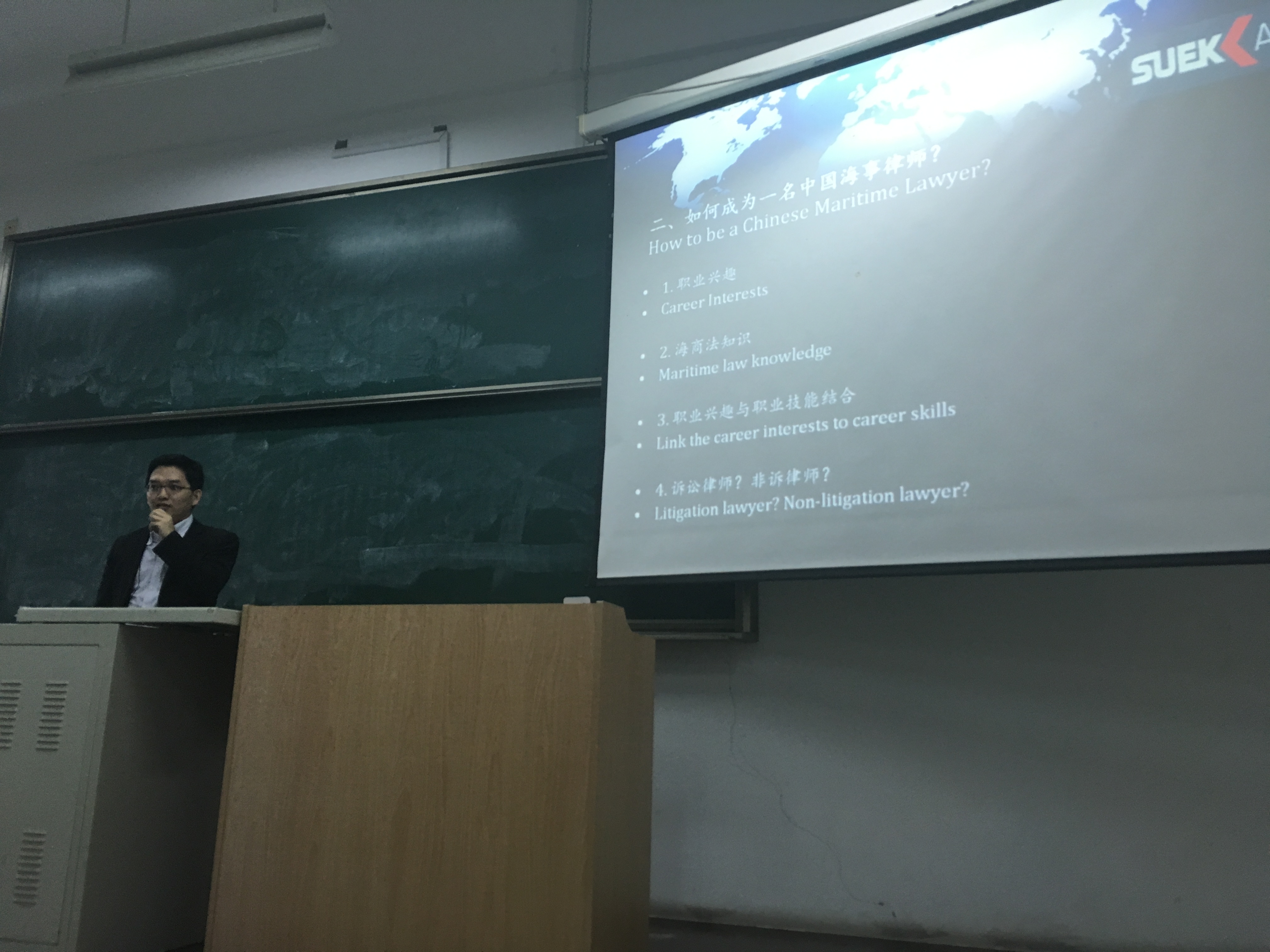 4月26日下午,国际法学院在主教A102举办题为“海商海事律师实务的发展与挑战”的讲座,邀请到SUEK AG苏艾科(上海)贸易有限公司法律顾问、资深海商律师谢建峰先生为学生分享专业背景与律师从业经验,讲座由张正怡博士主持。