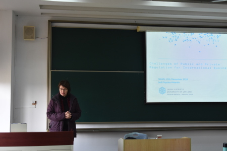 2018年12月17日上午,上合组织培训基地海外驻访学者,芬兰拉普兰大学法学院院长、商法学教授Soili Nystén-Haarala在信教312教室做了一场别开生面的讲座: Challenges of Public and Private Regulation for International Business(公法和私法规制对国际企业的挑战 )。 此次讲座由国际法学院宋俊荣副教授主持。