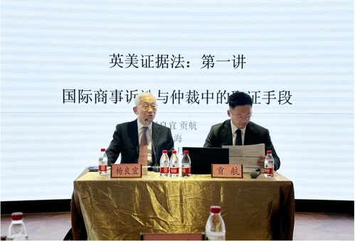 开课仪式结束后,第一讲课程以“国际商事诉讼与仲裁中的取证手段”为主题,上海仲裁委员会委员、上海国际仲裁学院主席、国际著名独立仲裁员杨良宜先生与在英美法和国际仲裁业务领域具有丰富经验的贡航律师主讲。主讲人首先强调学习证据法等国际商事游戏规则的重要性,勉励各位同学坚持学习、终身学习、不断进取。随后,杨良宜先生和贡航先生结合典型案例和本人在仲裁实践中的实务经验,为同学们介绍了不同的证据类型,重点讲解了在国际诉讼与仲裁中主要的取证手段,以及不同取证手段的要件、特点和利弊。