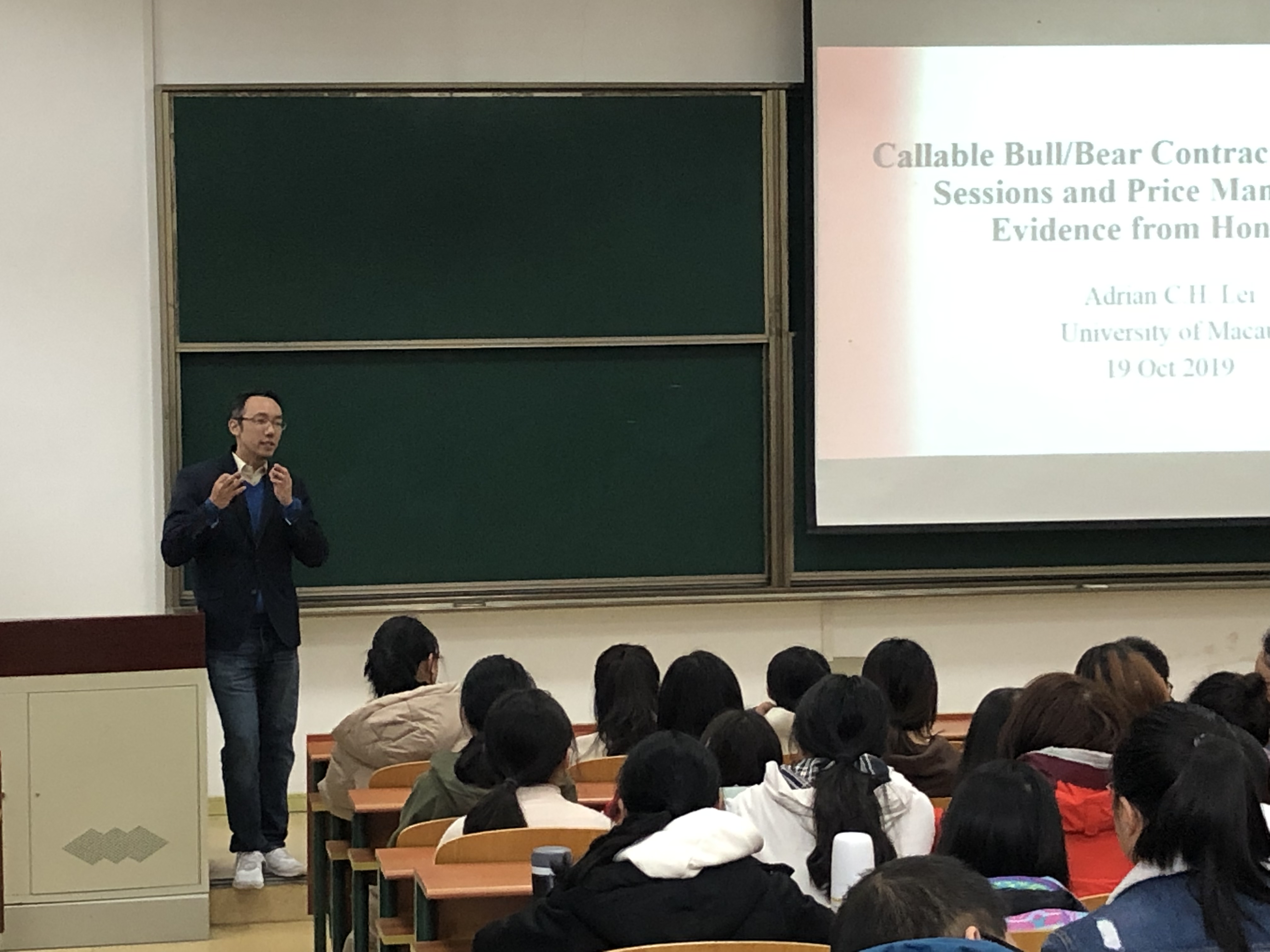 近日,澳门大学李卓雄教授驻访我校,进行学术交流访问。驻访期间,李卓雄教授为我校经管学院开展了有关金融衍生品——可赎回牛熊证的(callable bull/bear contracts,以下简称CBBC)的相关知识讲座,介绍了CBBC的概念、历史及在香港市场的具体操作。