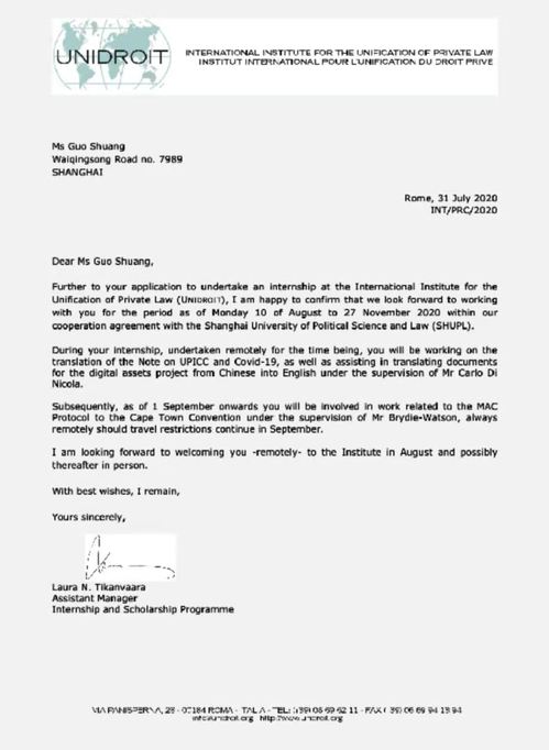 除了工作交流方面,这次实习最重要的是能让我更深入地学习和研究《MAC议定书》、《国际商事合同通则》等,接触到国际私法领域最新的研究内容和方向,了解了关于动产设备国际融资的最新发展,以及《国际商事合同通则》如何有助于解决疫情以及因此而采取的措施所造成的主要合同中断提供指导,这对我之后的学习和学术研究提供了很大帮助,同时也加深了我对国际组织工作运行模式的了解,提升了将理论知识与实践运用结合的能力。