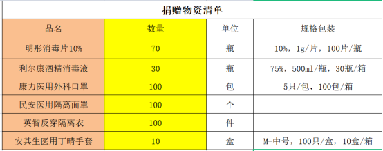 在募捐活动发起人周佳辉和柴文龙校友的大力支持与积极帮助下,多名校友的积极响应,募捐活动取得圆满成功。捐赠物资主要包括:消毒液、隔离口罩、隔离面罩、隔离服等。