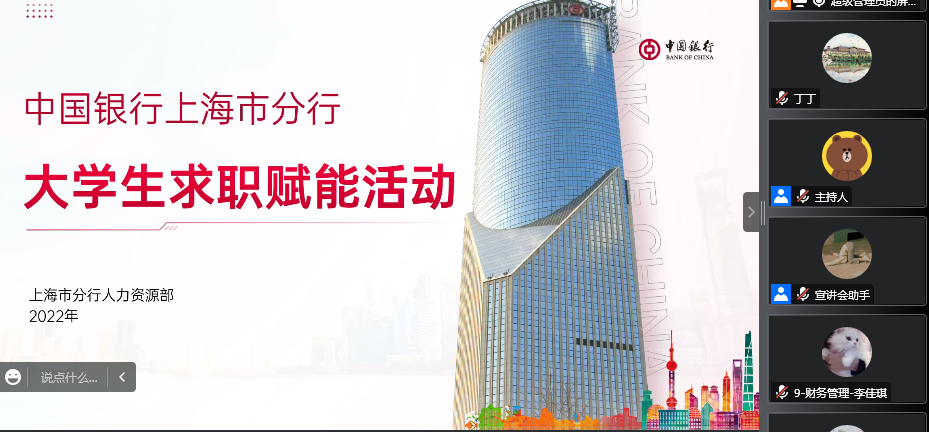 目前,企业正处于2023年招聘的启动阶段,经济管理学院主动对接相关企业单位进行校园招聘宣讲会。10月8日,中国银行上海分行在线上针对经管学院举办了2023年校园专场招聘宣讲会,学院数百名毕业生参加。