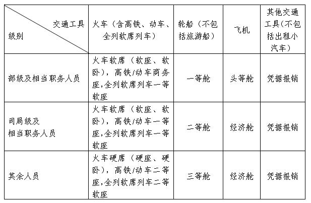 第七条 出差人员应当按规定等级乘坐交通工具。乘坐交通工具的等级见下表: