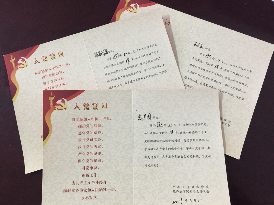 为了深入开展“两学一做”的主题教育活动,进一步强化党员的身份意识和责任意识,促进党组织与党员的沟通交流,创新党员教育管理方式,经济法学院党总支自今年十月开始,精心制作了“党员生日卡”。无论是学生党员,还是教师党员,在每位党员的入党纪念日,总支都会给每位党员送上一份特殊礼物——党员生日卡,祝贺他们成为党员的第二个“生日”。